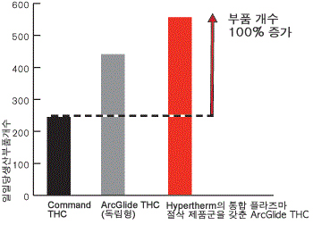 ※ 12mm 연강에서 작업자의 개입 없이(130A) 적절한 절단 높이에서 0.25mm 미만의 편차를 가진 시작 소모품 수(도표 참조)